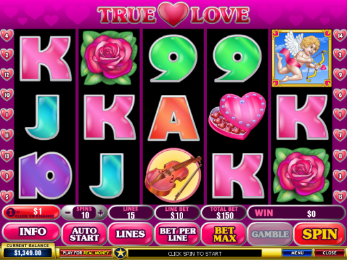 True love is a romantic video slot. The slot was decorated with pink color and romantic slot around the interface. If you want to play True Love, it is necessary to buy the coins with nomination from 1 cent. Maximal nomination of the coin is 5 dollars. Even button that changes nomination of the coin is decorated beautifully. When you press it all possible values came out at once with a sound in the background. You need to choose the one among them. Choose the paylines, the number of which can reach 15. You can bet in every payline up to 10 coins. The maximal bet in the game is 750 dollars per spin, but this is something crazy that only people in love can do! In this way the video slot is good for different categories of players. Big-budget players or high-rollers and people with small budget who come to the online casino to play and enjoy the game without trying to get big gain.